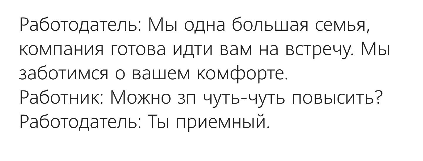 А я тут недавно на собеседование ходил. Оператором станка с ЧПУ. Завод металлоконструкций Аполло. Спрашиваю, что по З/П? Менеджер долго высчитывает на калькуляторе и гордо показывает цифру 50000. Спрашиваю, какой график работы? Отвечает 2 дня в день, 2 дня в ночь, 2 выходных. По двенадцать часов. Я быстро прикинул, интересуюсь, это же 230 - 250 часов в месяц? Он говорит ну да, мол где-то так, ну ещё работники иногда один из выходных выходят подработать, чего мол на диване дома валяться, когда можно подзаработать. У меня просто рукалицо. Натуральное рабство.