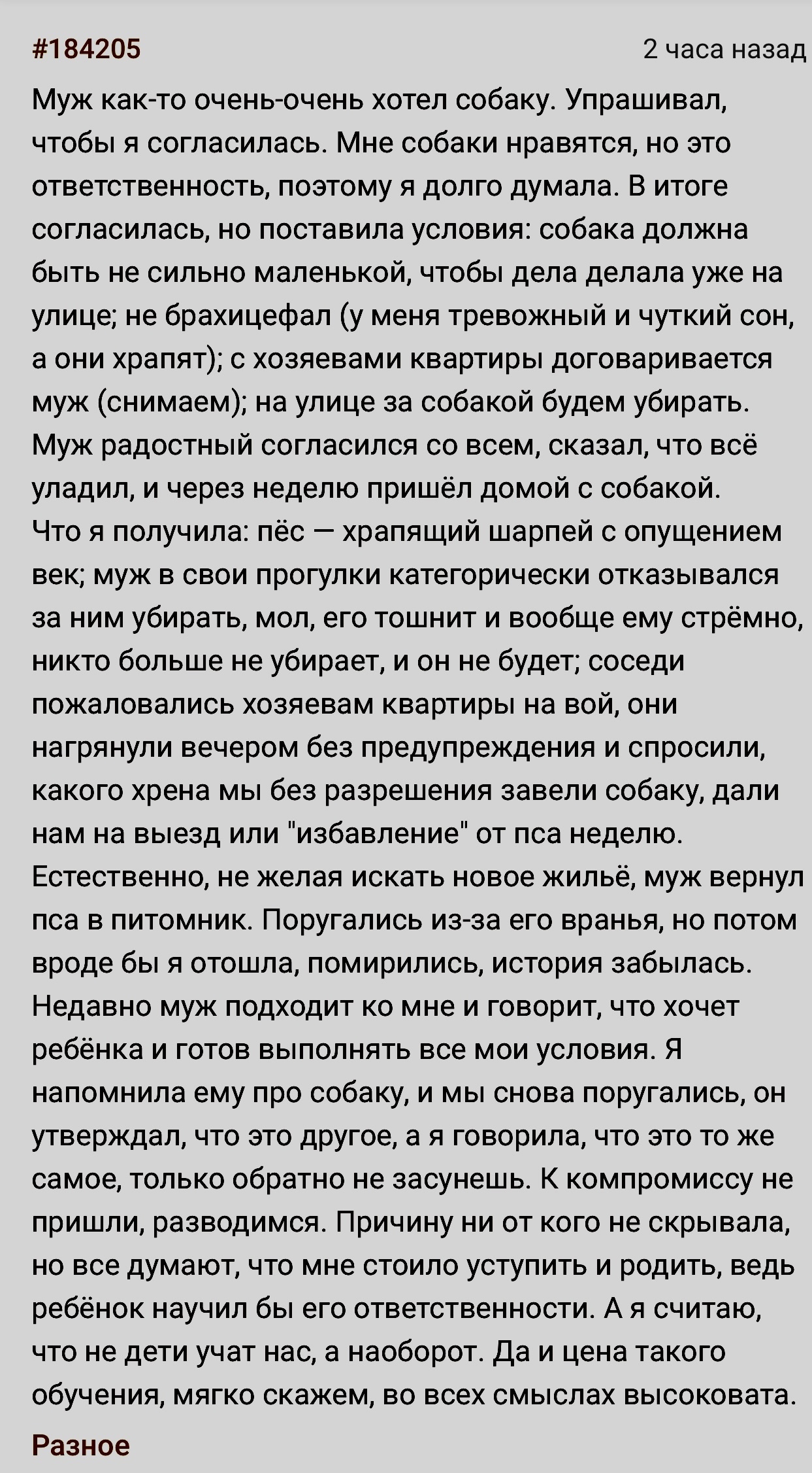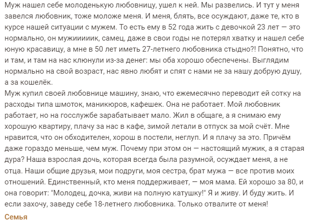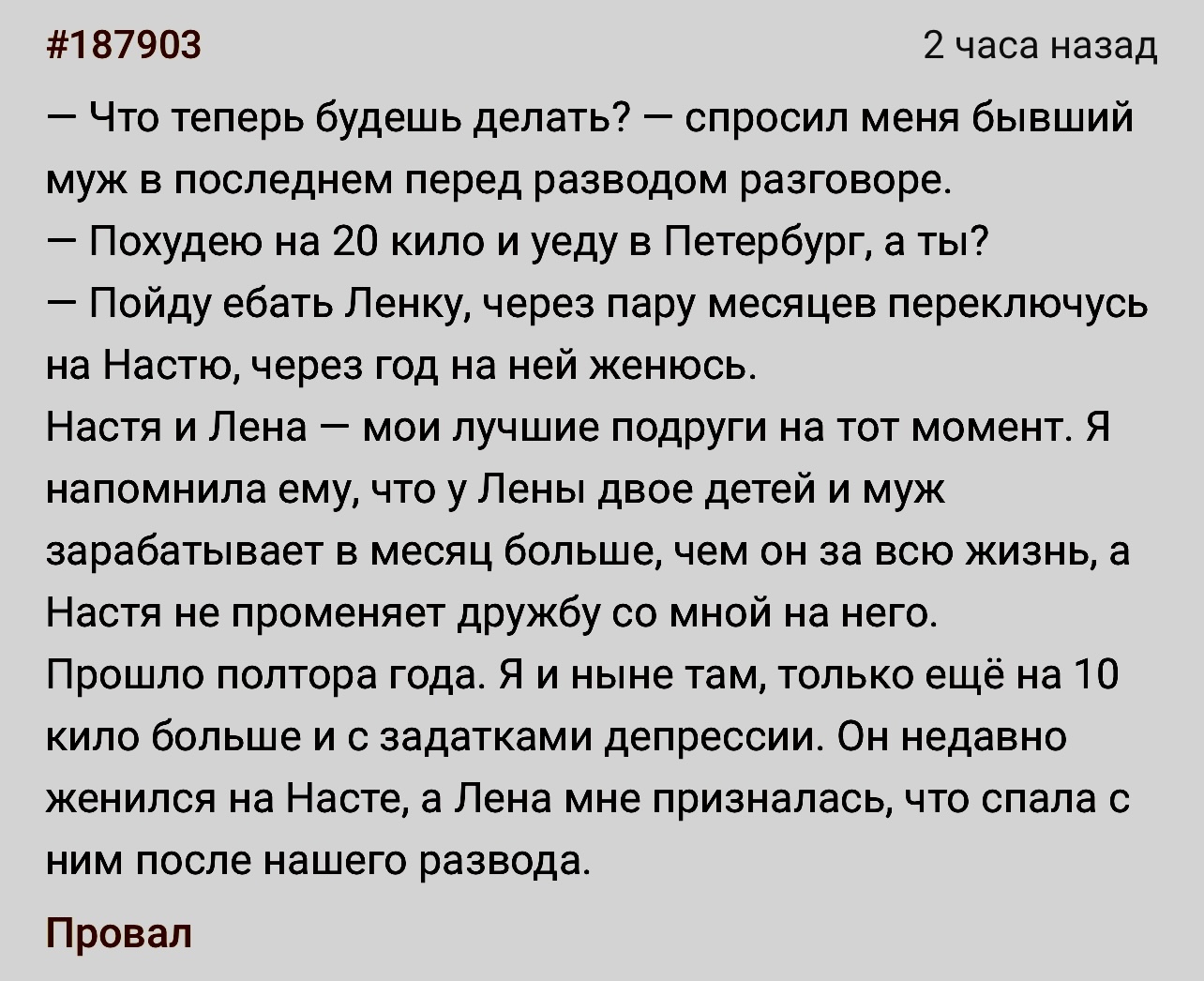У меня в кругу общения за последние годы у знакомых случается херня по одному и тому же сценарию. Женаты, дети, ипотеки. С женой прошли через всё, и в горе и радости, как говорится. Вот живут и всё у них хорошо. Тут случайно на работе/на улице/где угодно встречается девушка. Возможно, моложе/красивее или ещё что-то. И всё, чувства, отели, квартиры на ночь. В сексе бесподобна. В общем, любовь. Та самая. Жену бросаем, на детей пофиг. Снимаем квартиру и живём с любовью. Домой бежим вприпрыжку. Вот оно, чего не хватало. Проходит месяц. Чёт не то. Не гладит одежду, не стирает, готовит или плохо или никак. На замечания истерики. Да и секс уже редко и не очень. И домой уже не хочется особо. И стыд перед той, которая была с тобой всегда. И ты у разбитого корыта. И что делать не знаешь. Идёшь домой, как побитая собака, с надеждой, что пустят. Пускают. Но всё, что будет дальше, совсем не то. Морали нет. Просто, если кто-то прочитает, и в данный момент думает о похожем - не делайте так. Бывает кризис отношений, можно потерпеть, можно к психологу, в отпуск. Но только не первую попавшуюся писечку.