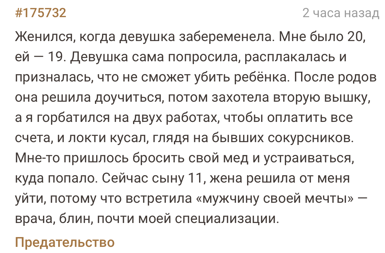 Пыталась объяснить, что поменяй хронологию бы, разведись и гуляй, это хотя бы было уважительно по отношению ко мне, к браку, и к 13 годам вместе. Сказал что я прицепилась к браку, свидетельство о заключении это всего лишь "ссаная бумага"©