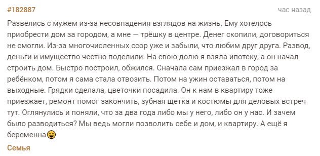 Но мне 42 года. И именно сейчас я среди сверстниц вижу особенно много женщин в разводе. Потерянных, несчастных, не понимающих как жить дальше. Ведь они вложили лет 20 в семью. В мужа. В детей.