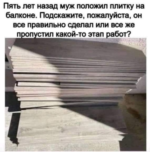 Спустя полчаса из магазина вернулась жена прораба и уронила пакет с продуктами на голову мужа.