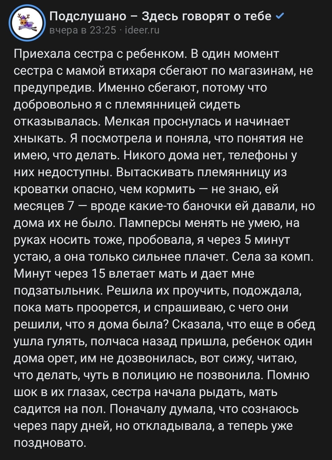 Через 10 минут звонит мама с истерикой - как ты посмела выставить брата? А мне уже было так похер, что все ей высказала, что не обязана, не должна, не хочу в конце-то концов! Уже несколько дней прошло, с родственниками не общаюсь, считаю что не много потеряла. Кота в ветеринарку свозила с почечной коликой, работаю как не в себя. И нахрен бы не нужны мне такие гости. Простите за эмоции.