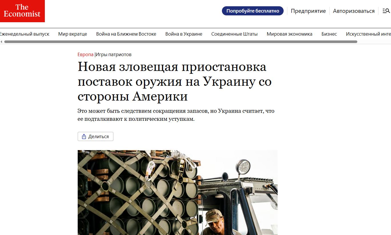 И начнём с The Economist, который прямо заявляет: "Все поставки оружия из США прекращены"⛔️