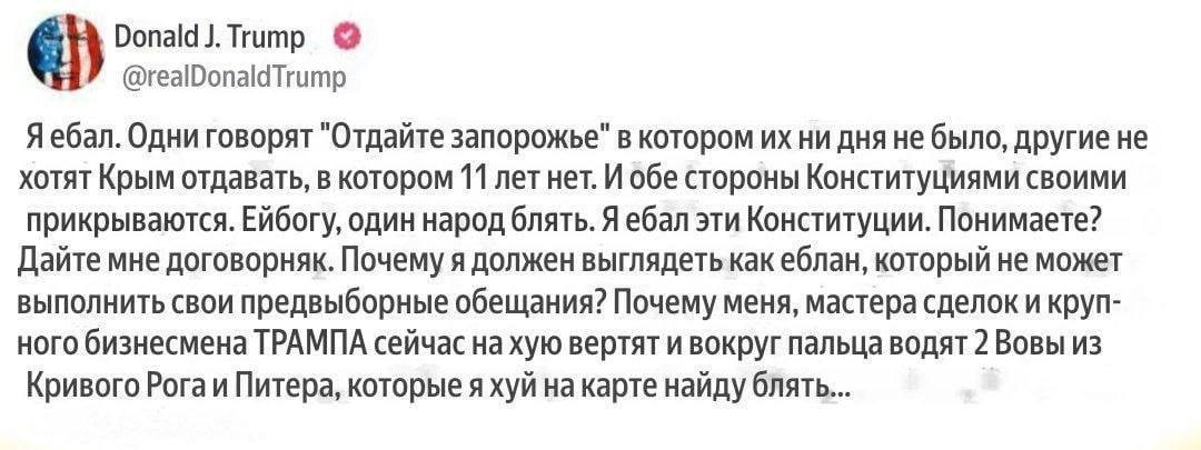 Так что Дональд лавирует, пытаясь всё же вытянуть стороны на "нейтральный мир", при котором Украина, как бы, и не проиграет (фиксация по линии фронта, нейтральный статус, но без признания Киевом Крыма и т.д.).