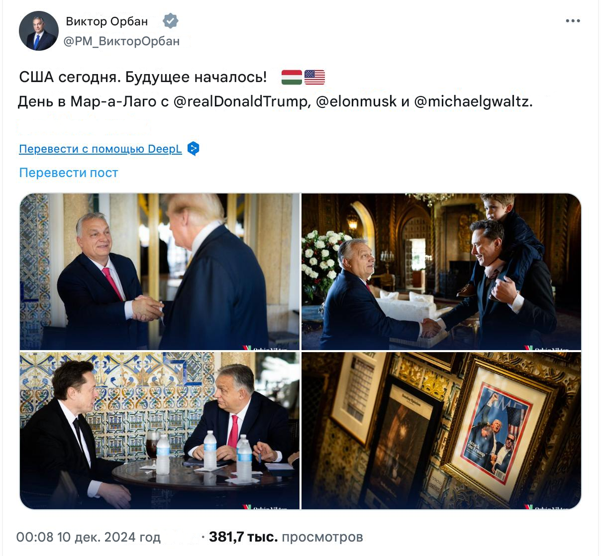 🔹 Итак, 10.12.24 Орбан сообщает, что весь день провел в переговорах с Трампом в его резеденции: