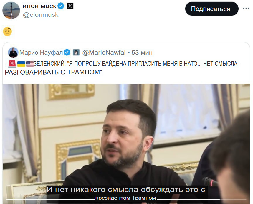 «На столе есть [мирное] предложение, которого не было в наличии за последнюю тысячу дней... Одна сторона (РФ) рассмотрела его и сочла приемлемым, но другая сторона заняла позицию неприятия». 💬