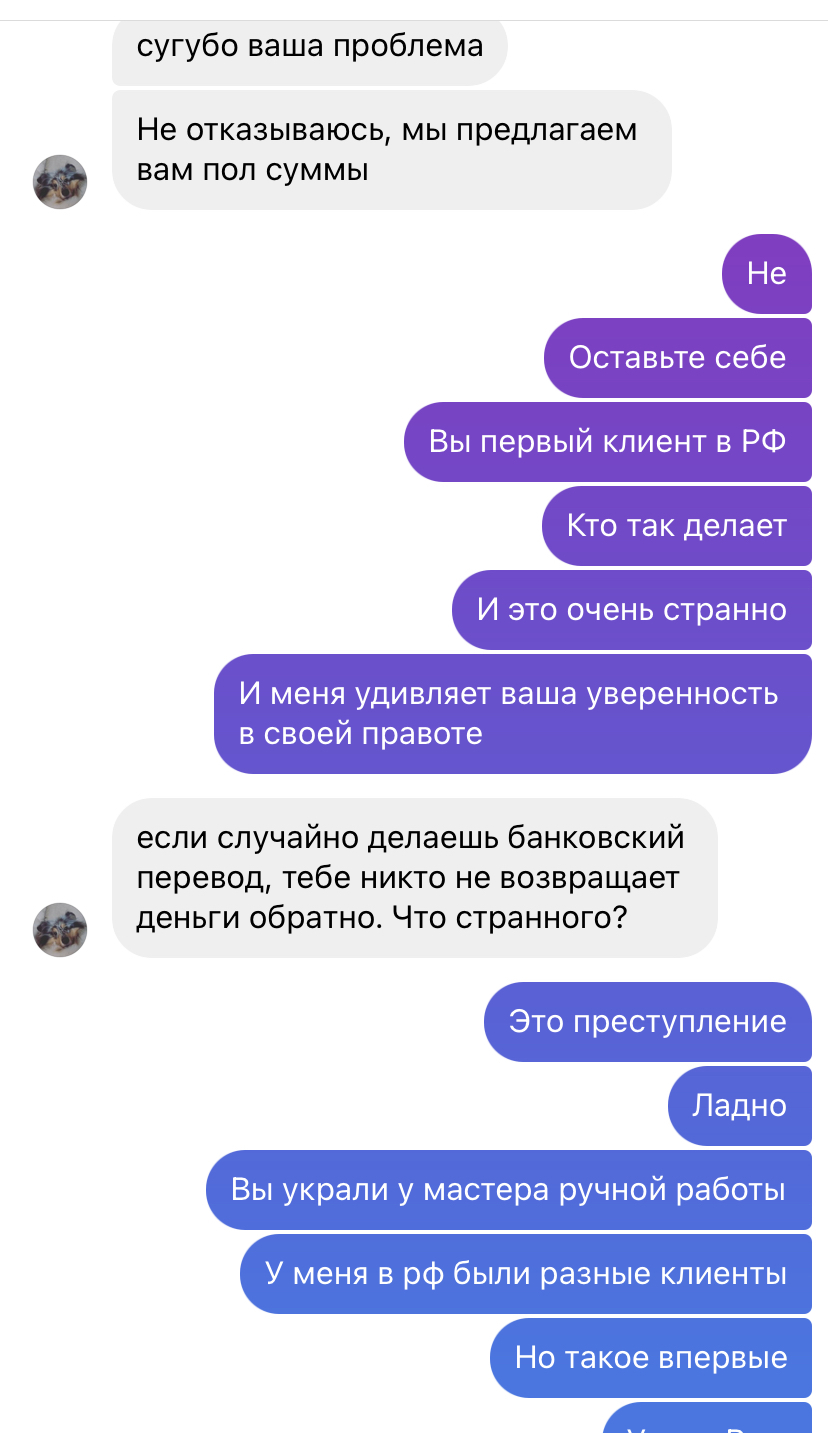 Честно, я был бы рад получить 5500, чтобы себестоимость покрыть хотя бы, но, и многие меня за это осудят, моя гордость стоит дороже 5000 рублей, и я не дам человеку, который меня просто обманул, повод считать, что он решил со мной вопрос.