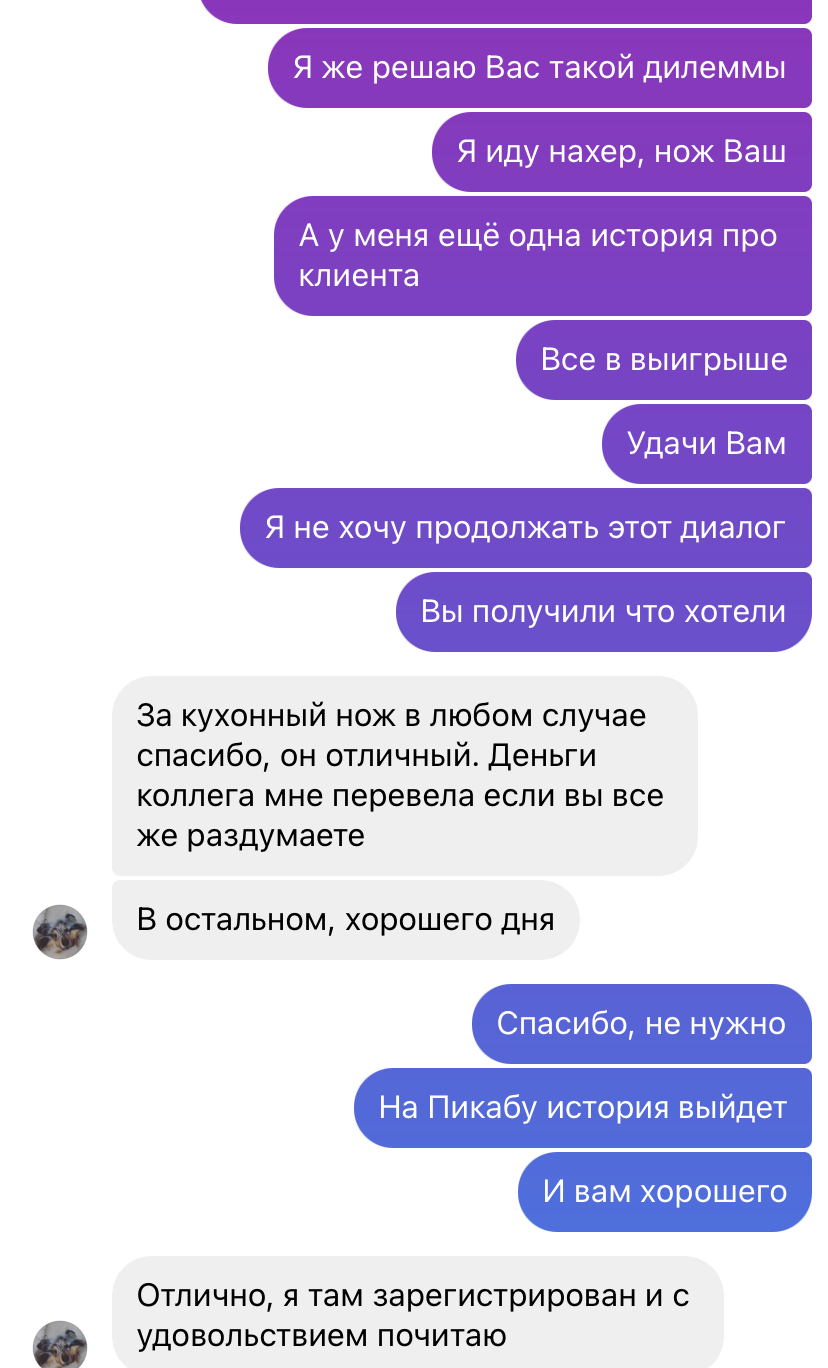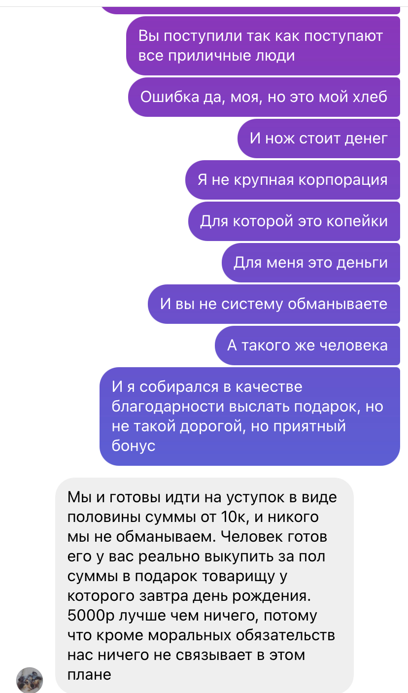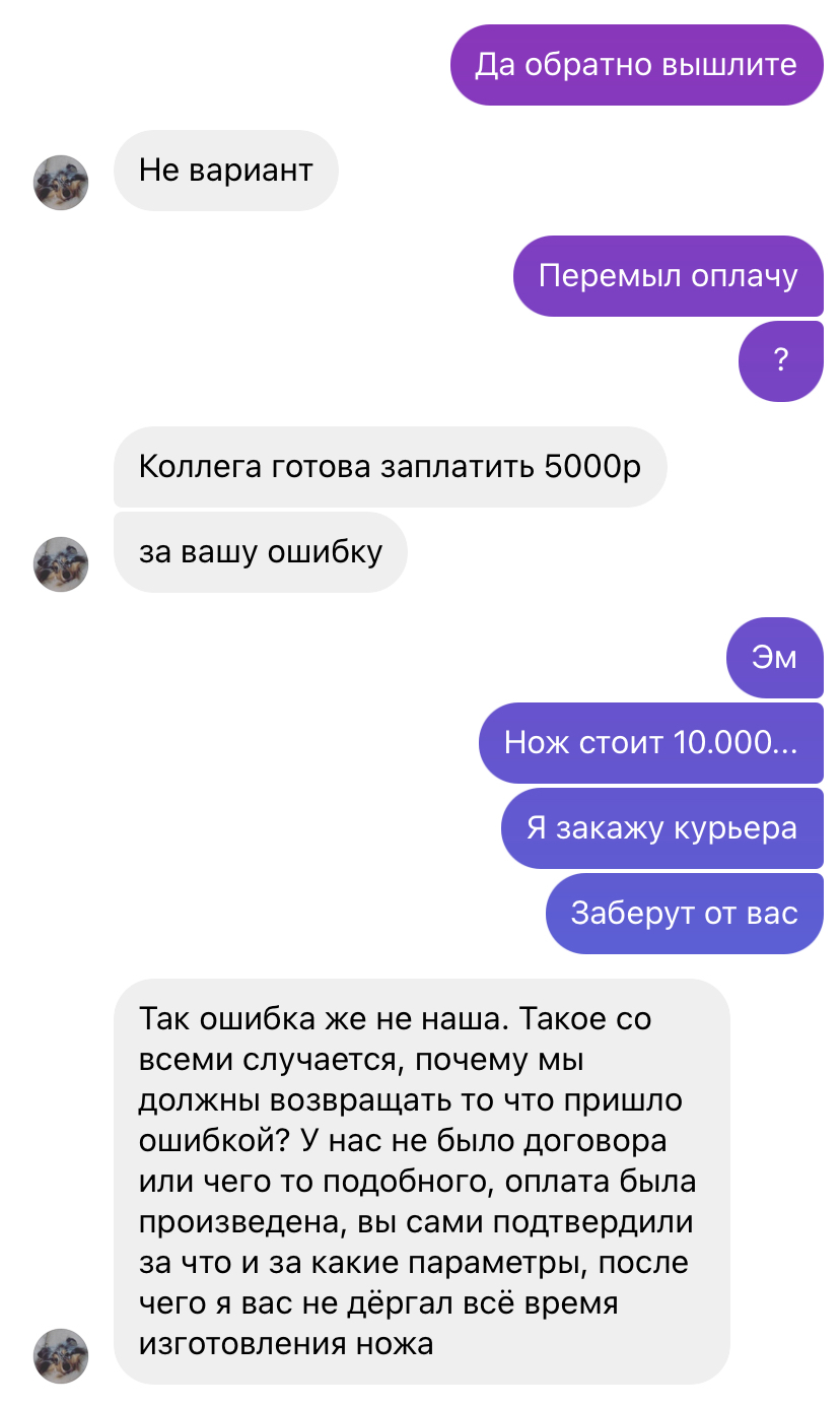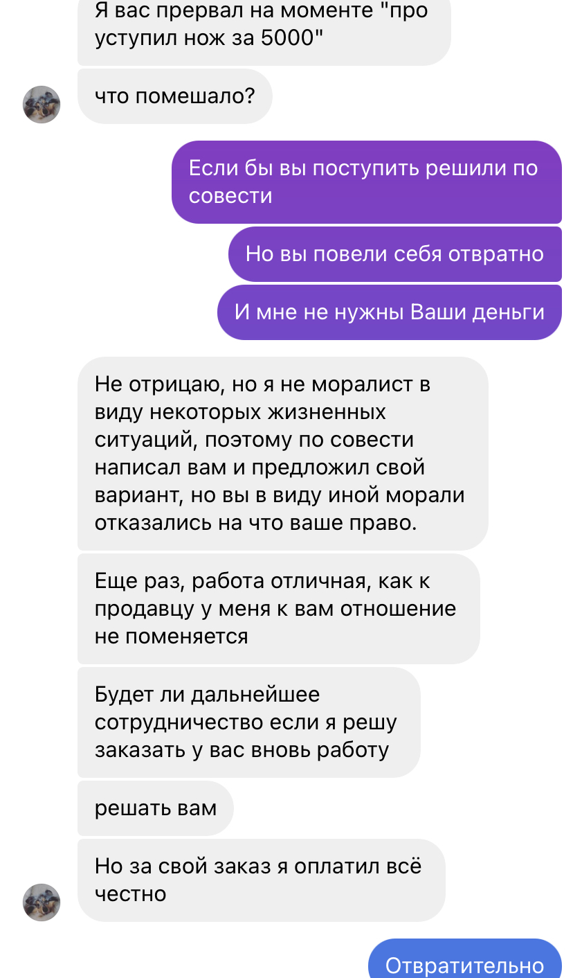 Честно? Я бы уступил нож за 5000. Я не из тех, кто жлобится делать подарки. Я наоборот стараюсь лишний раз в конфликт не идти, а сделать приятный подарок. А если клиент идёт мне на встречу, и, тем более, показал себя честным, то такому и не жалко 50% скинуть, но наш герой не дал мне такого выбора. Он пошёл другой дорогой: или делаешь мне скидку 50%, или я вообще не заплачу. Честно, мерзкое ощущение)