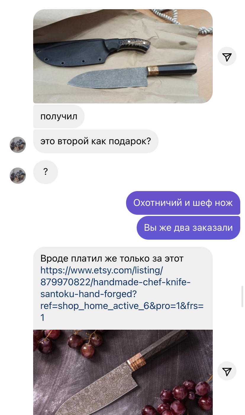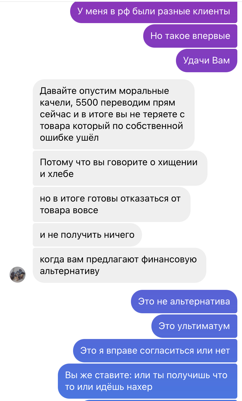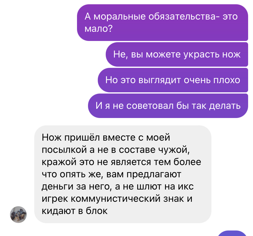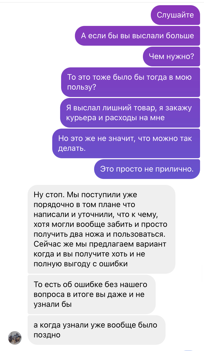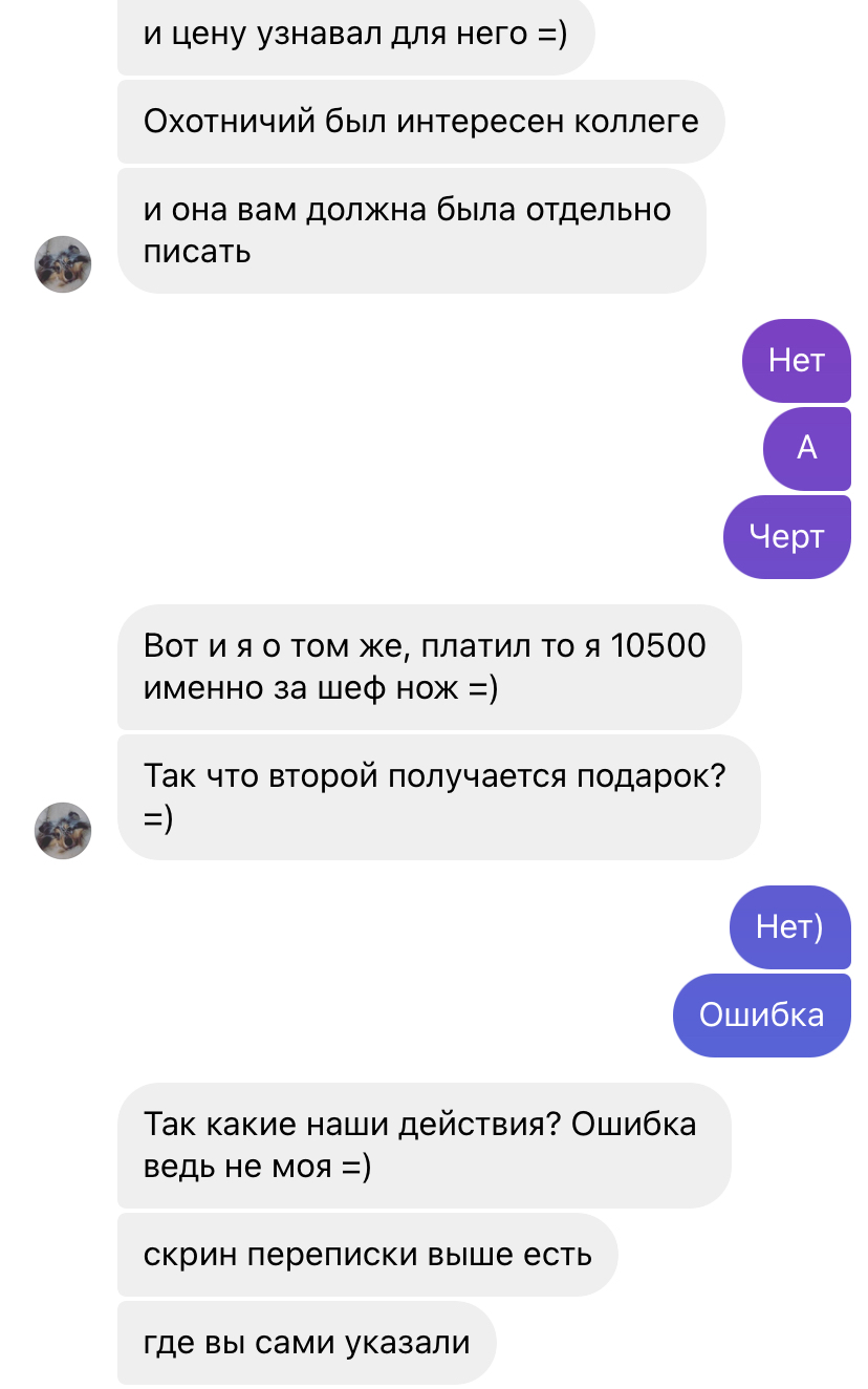 Честно? Я бы уступил нож за 5000. Я не из тех, кто жлобится делать подарки. Я наоборот стараюсь лишний раз в конфликт не идти, а сделать приятный подарок. А если клиент идёт мне на встречу, и, тем более, показал себя честным, то такому и не жалко 50% скинуть, но наш герой не дал мне такого выбора. Он пошёл другой дорогой: или делаешь мне скидку 50%, или я вообще не заплачу. Честно, мерзкое ощущение)