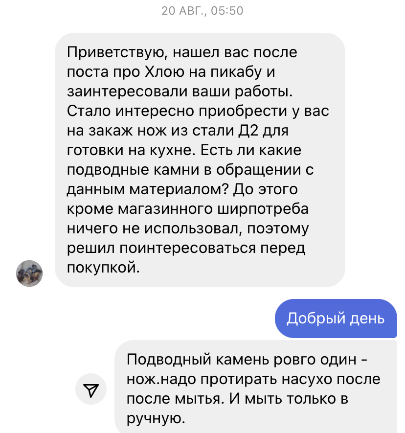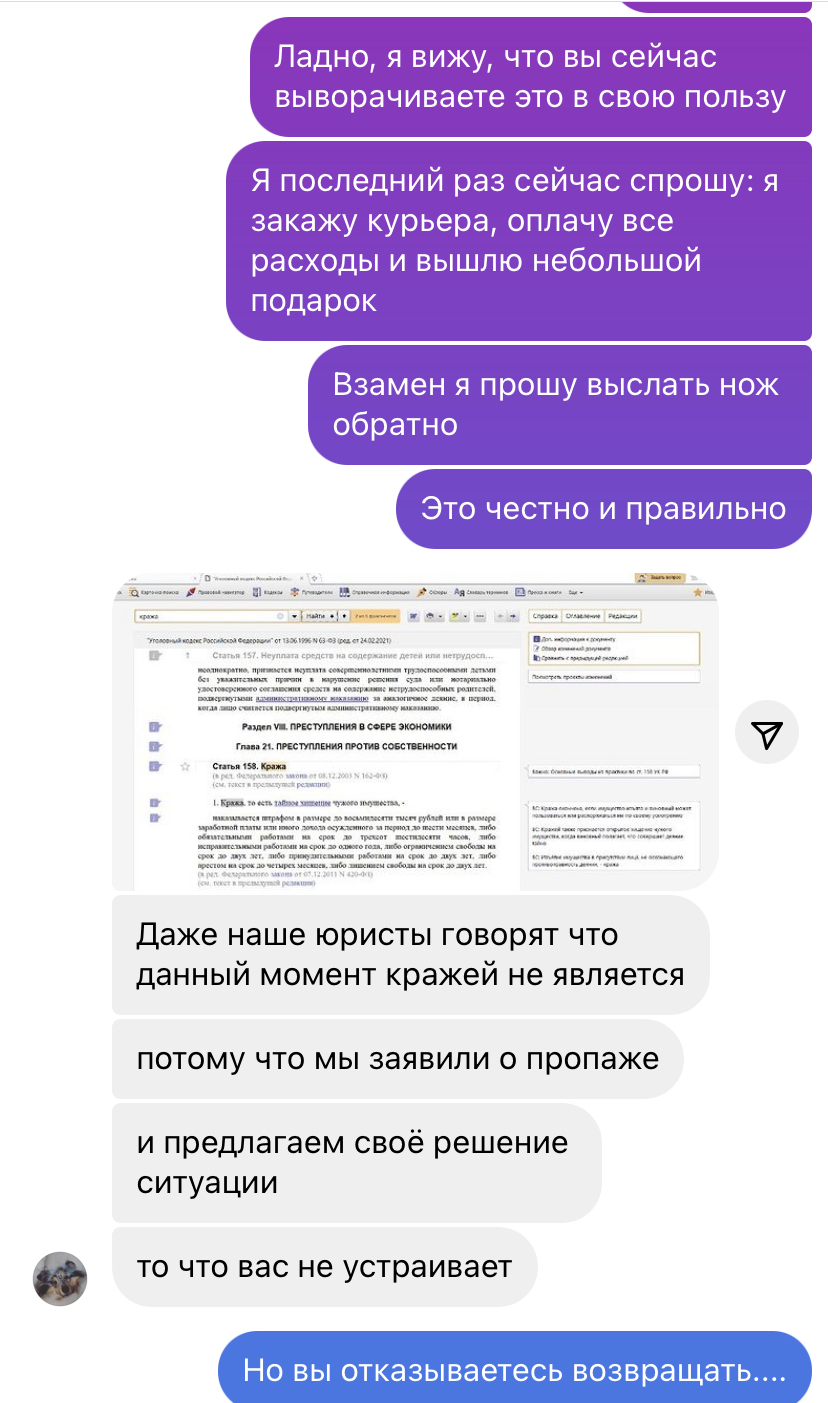 Обсудили про ножи, после чего человек взял перерыв на раздумья. Потом пишет снова: