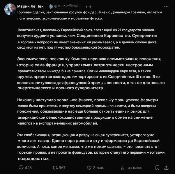 Марин Ле Пен также раскритиковала сделку, назвав её политическим, экономическим и моральным фиаско.