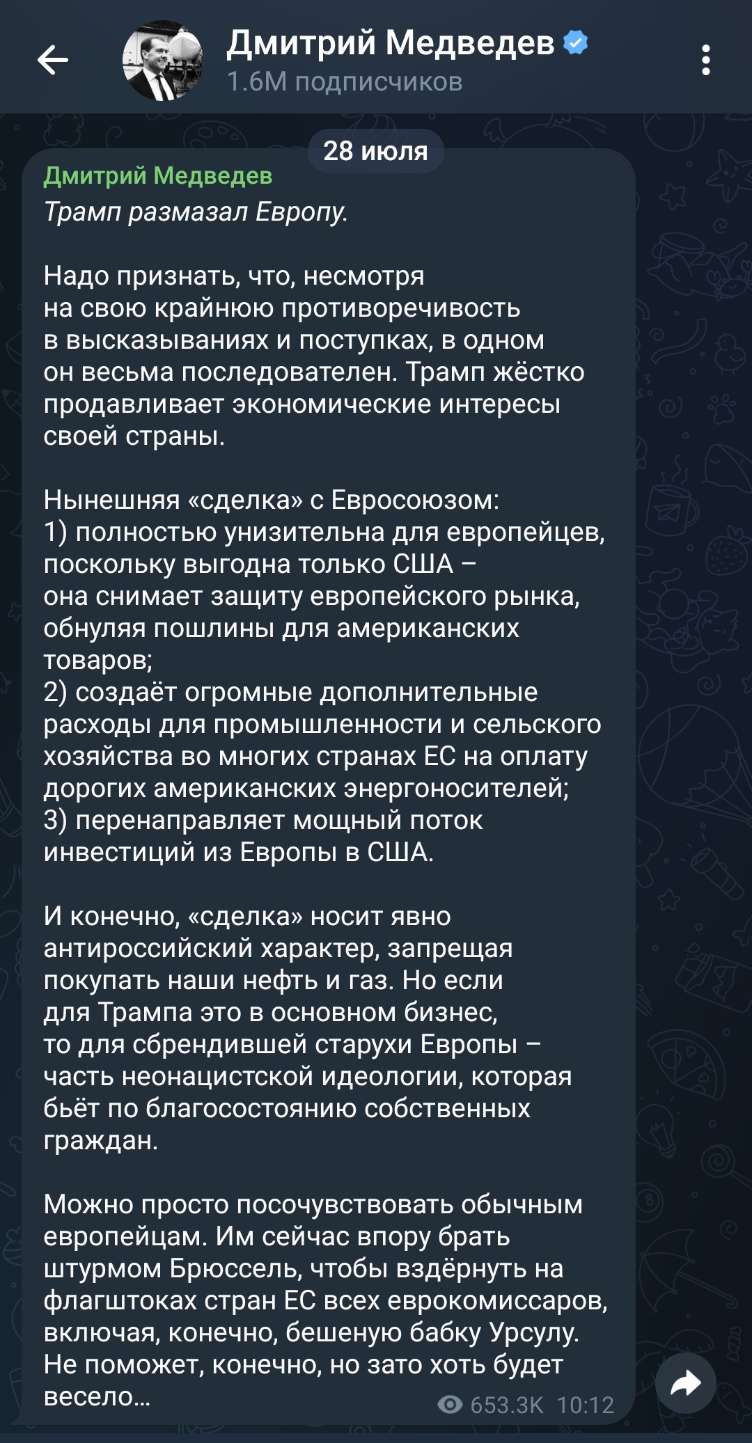 Да, без торговли с Америкой ЕС ждёт кризис, но с такой "торговлей", как сейчас, европейские компании просто загнутся в ближайшие годы, ну, или переедут в США, как того хочет Трамп.