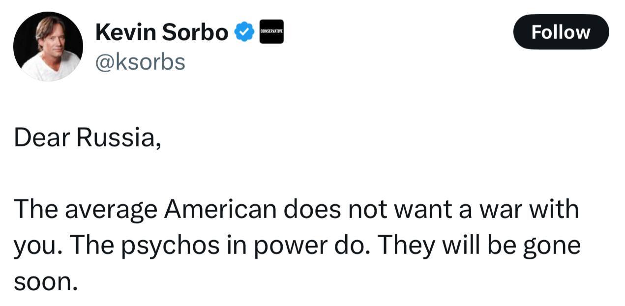 Дорогая Россия, среднестатистический американец не хочет войны с вами. Этого хотят психи, находящиеся у власти. Их скоро не будет