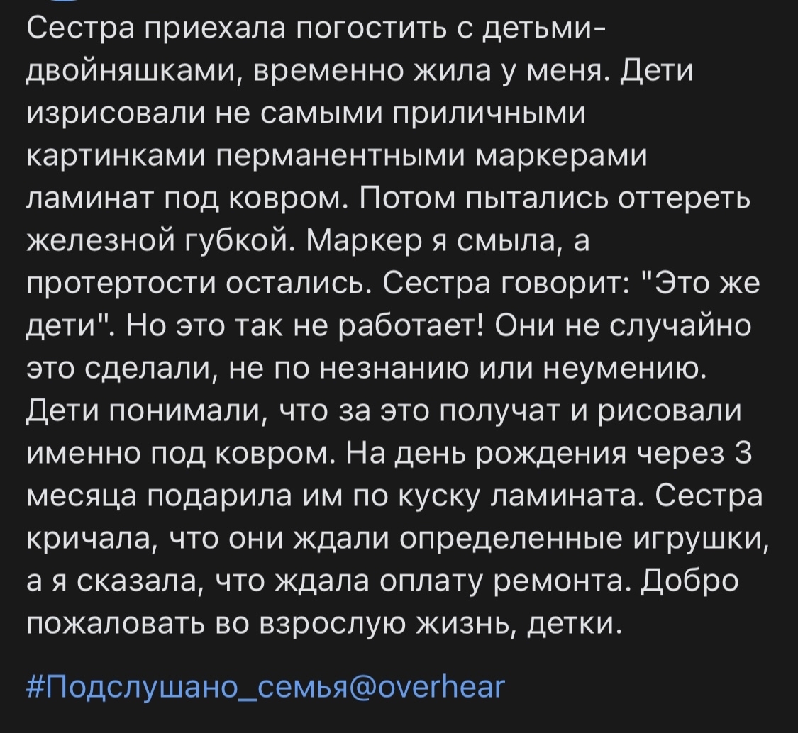 Не знаю, что послужило мотивацией, но я начал немного потаскивать деньги из карманов родителей, когда мне было 7 или 8 лет. Жили мы не бедно, но видимо чего-то не хватало. Где чирик бумажный возьмёшь, где мелочь - пойдёшь купишь ролтон или дольку яблочную. Так продолжалось с весны по середину лета, пока я не залез в антресоль и не нашёл там солидную котлету в виде 5-6 тысяч. 2003 год. Сделав небольшой подсчёт, я решил, что недоимку в 1500 никто не заметит. Счастью не была предела. Кормил половину двора на «казенные», а также приобретал авторитет среди старших. Даже заплатил чуваку 300₽ за то, что он мне обработает палку с дерева и перемотает рукоять чёрной тряпочной изолентой. Купил себе несколько пачек «крутых пацанов» ( это где был чупа-чупс и какие-то амулеты из слоновой кости. Сижу весь увешанный медальонами как какой-то диллер из Бруклина и понимаю, что кто-то хватает меня за шкирку. Это был старший брат, который сначала получил жёстких люлей от отца, т.к. первый был под подозрением. Оказывается батя делал дома какой-то небольшой ремонт и ему не хватило материалов. Глава семейства был сильно возмущён, недосчитавшись почти 1/4 суммы. Старший брат был на занятий, за ним пришёл аж дежурный по части, забрав с занятия и сказав, что его срочно ждёт отец дома.