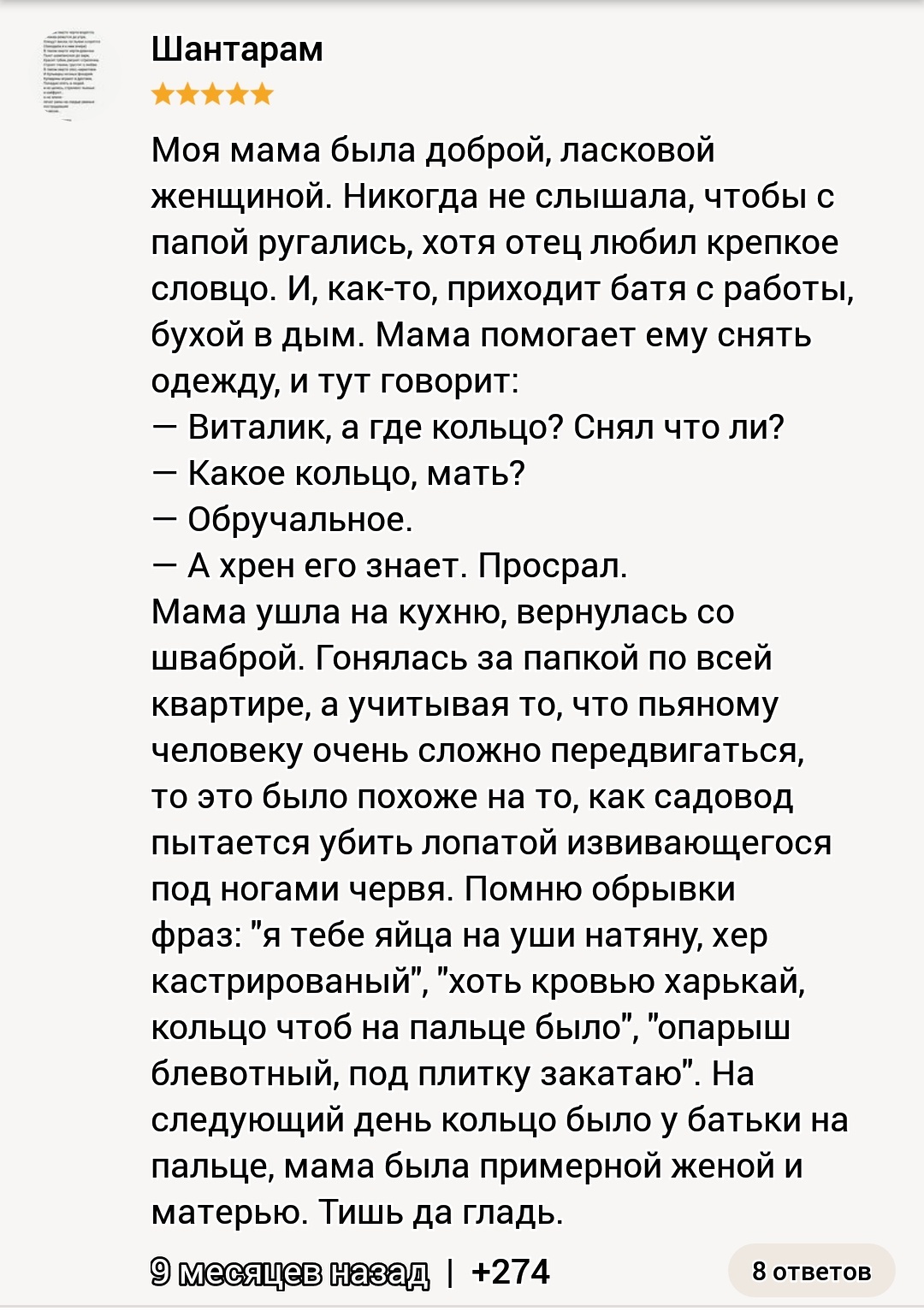 Начал качать пресс, сменил работу, сменил стиль, доделал ремонт в квартире, который начали ещё до отпуска, съехались, перевезли все вещи. Жена уже не могла целовать, не терпела прикосновений, про секс я даже молчу, но спали в одной кровати. Я пытался быть дружелюбным. Так прошла неделя. Потом меня это доконало и я поставил условие, что, если она будет дальше продолжать топтать наши отношения, то может собирать вещи и уходить. Через день спросил, мол, ну что. Отказала. Ну, что ж, будь посему. Это была среда. Я уехал к матери. Разговаривал с ней, мать мне поведала, что оказывается таки есть мужик.