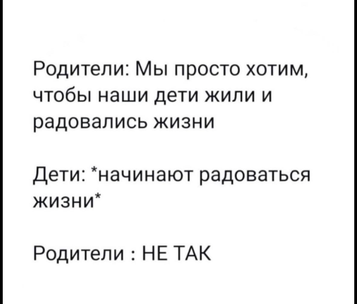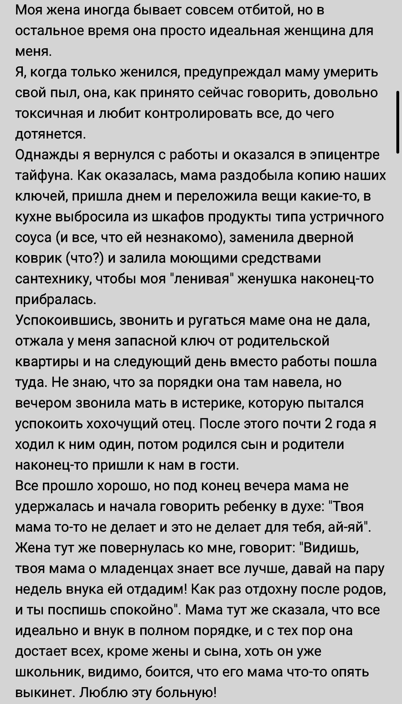 Пусть мы будем неблагодарными детьми, но родители кроме жизни и пиздюлей нам ничего не дали, а теперь требуют отдачи.Нам с мужем почти 40 (в волне милф и мужичков участие не принимаем), сын вырос, решили хоть немного для себя пожить и тут нате!