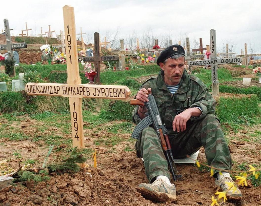 Русский доброволец, приехавший воевать за сербов в Боснийской войне, сидит у могилы погибшего друга. Его похоронят неподалеку через месяц