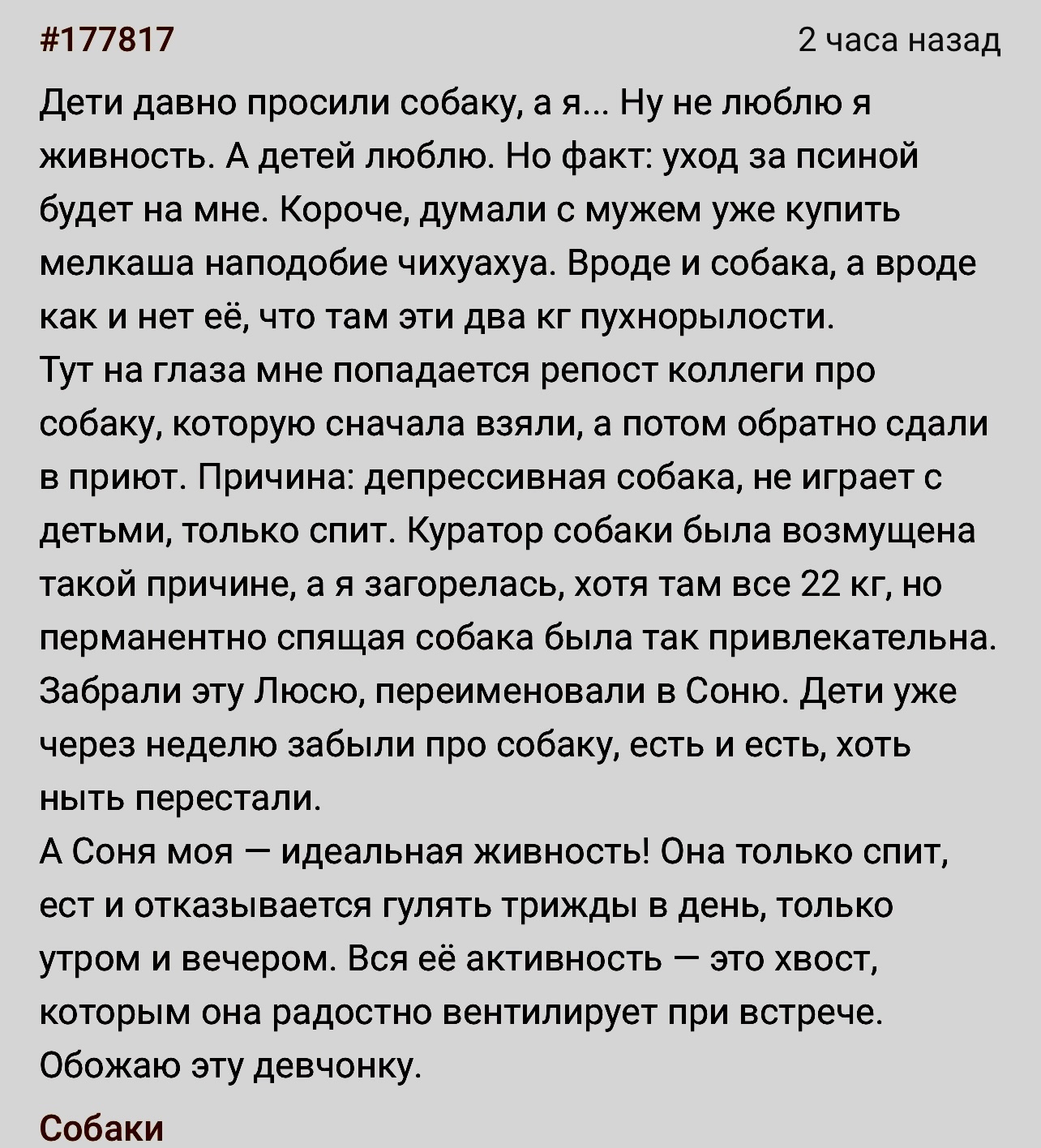 Но случился тут у нас, совершенно внезапно(хы), подростковый возраст. Расцвет пришёлся на начало учёбы, и всем нам резко пришёл пи... Депрессии,панические атаки, качели, поведение в школе.Всё во всём цвету. Кроме любви, заботы особенно помочь нечем, повела к спецам, на каких можно рассчитывать на переферии. Выписали препараты, от которых, мне кажется, ребёнок ещё больше зарылся в себе. Больно смотреть на страдания и чувствовать себя безруким. Очередной звонок со школы я просто думала не вынесу. Пусть уже блин будет собака сейчас, хоть какая, главное не лошадь, переключится на неё, авось станет лучше. Хуже уж точно нет. Залезла в авито и начала искать по имеющемуся бюджету.