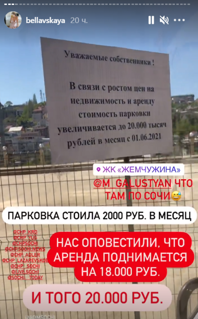 Горожанка показала объявление, в котором жильцов ЖК «Жемчужина» стоимость парковки с 1 июня увеличивается до 20 000 рублей в месяц.