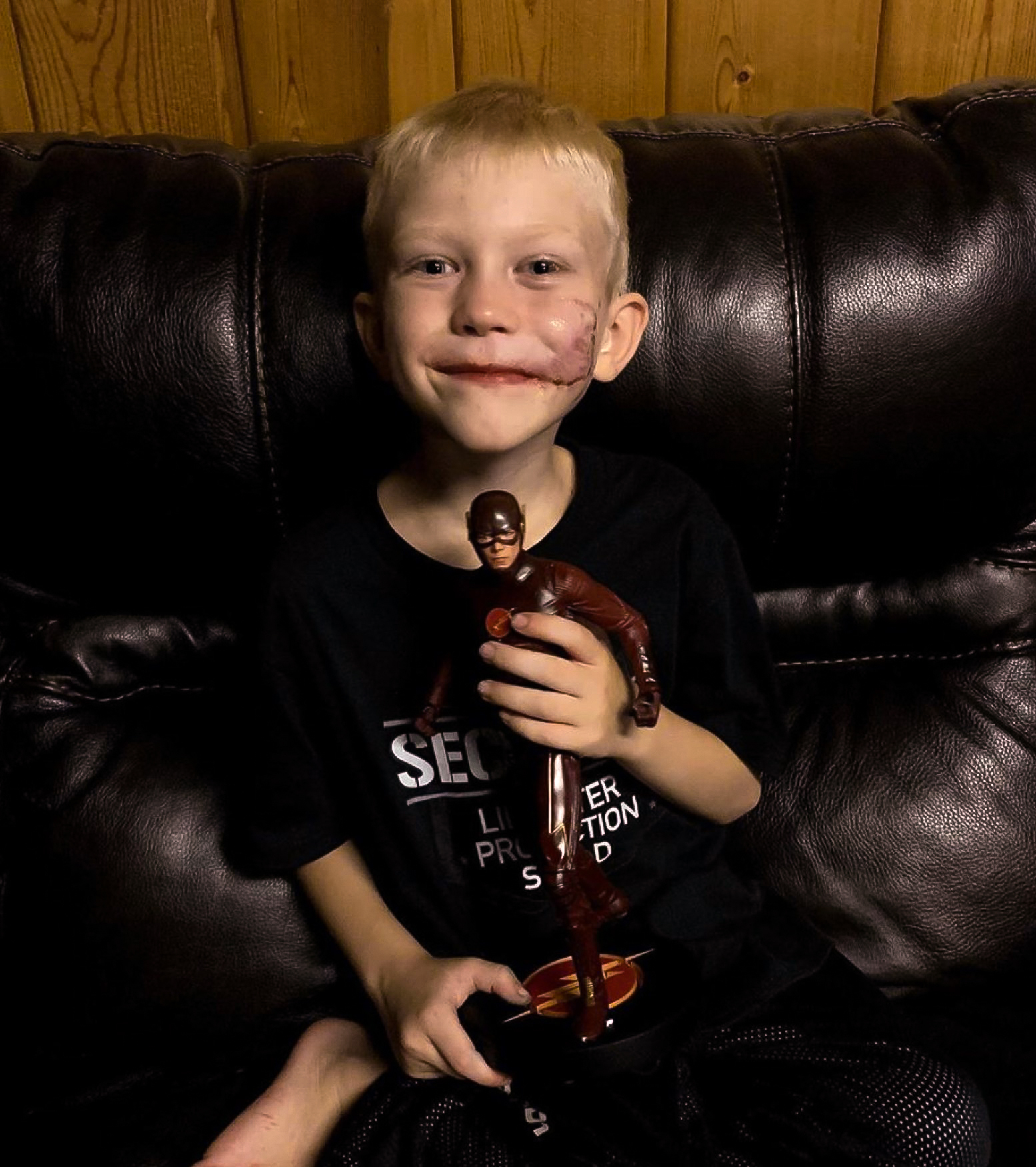 Это Бриджер Уолкер. Он защитил свою маленькую сестру от собаки. Получил укусы в лицо, кучу швов и шрамов, а потом мировую известность. Его приглашали на съёмки «Человека-Паука», подарили пояс чемпиона, гитару от рок-звёзд и так далее.