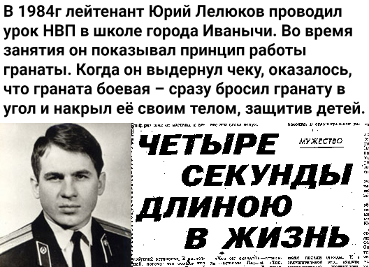 35-летний Юрий Николаевич Лелюков, старший лейтенант запаса, преподаватель военной подготовки школы № 2 посёлка Иваничи, совершил подвиг прямо на уроке. Он закрыл собой боевую гранату, которая случайно оказалась среди учебных. После его гибели учебные гранаты стали сверлить.«Внимание, – сказал Юрий Николаевич двадцати шести ребятам, сидящим в классе. – Вы давно просили показать принцип обращения с гранатой. Надеюсь, вам эта штука в жизни не пригодится, но тем не менее: слушайте, смотрите и запоминайте! Чтобы привести гранату в боевое положение, нужно прижать спусковой рычаг и выдернуть кольцо – я это делаю. Если отпустить рычаг, в учебной гранате просто щёлкнет, а в боевой раздастся хлопок и пойдёт дымок. До взрыва останется четыре секунды – сразу бросайте гранату. Итак, я отпускаю рычаг...»Тут раздался хлопок и пошёл дым. Вряд ли 26 девчонок и мальчишек поняли сразу, что случилось. Вряд ли это понял в первое мгновение и сам Лелюков. Боевая граната – в классе?!Но он был военным человеком. Дым пошёл. Значит, четыре секунды – и всё. Значит, надо спасать детей. Он бросился к окну. Внизу гуськом, точно утята, вышагивали на обед шестилетки.Метнулся бы к двери, но в коридоре, за дверью кабинета, тоже сидели дети. Школа была тесновата, иногда парты выставлялись прямо в коридор. Он повернулся к классу спиной, шагнул в угол, неловко нагнулся и намертво прижал гранату к животу. Пытаясь что-то сказать, только с силой выдохнул воздух…...Взрыв оглушил класс. В оглушительной тишине, точно снег, сыпалась с потолка побелка. В оглушительной тишине падали стенды. И в оглушительной этой тишине ошеломленные десятиклассники бросились к двери – все они выжили. Остались без отца 8-летняя Алеся и годовалый Юра, стала вдовой жена Лариса.