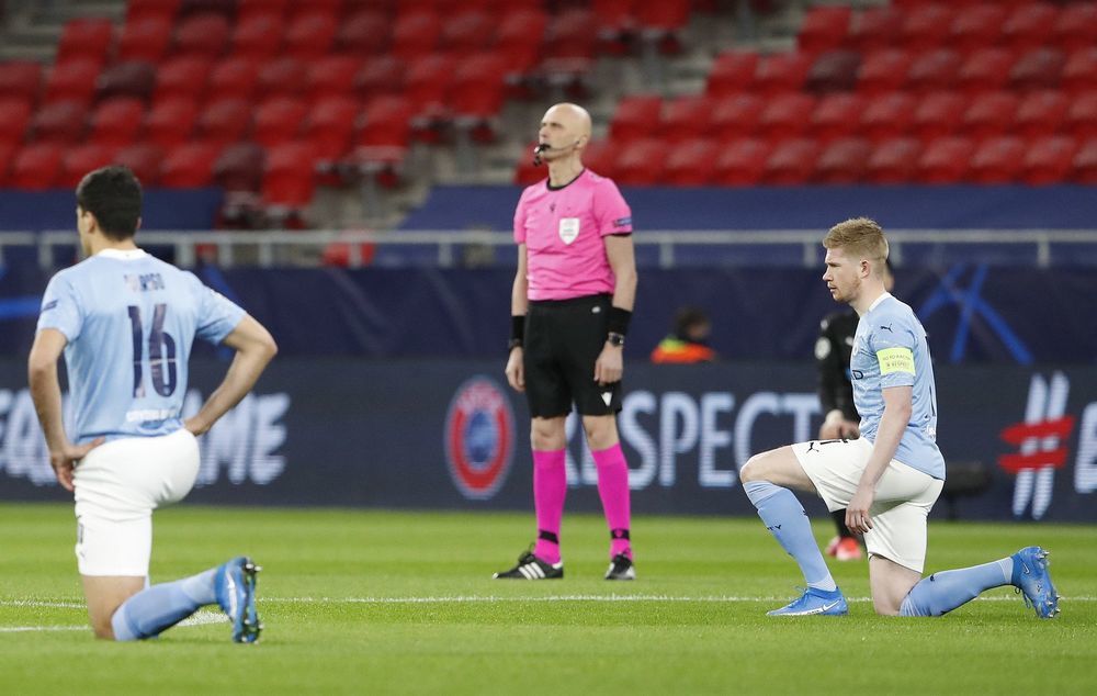 Все футболисты, находящиеся в этот момент на поле, встали на одно колено.