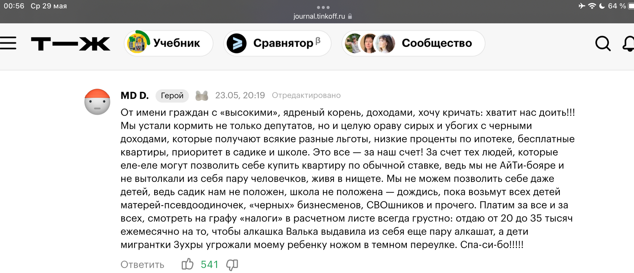 Скажу в защиту нормальным мигрантам и приведу пример. Киргиз, дворник плюс перевозки. Я просыпаюсь в 5 30, а он уже чистит наш двор. Выхожу в 7, уже чисто. И дальше он ещё ебашит до вечера на Пежо боксер, перевозки. И всегда спрашивает, как дела. Работает дворником, чтобы помещение под жилье дали и ищет другие варианты заработать. Вот этого Человека я уважаю. За его стремление и труд. Есть нормальные мигранты.