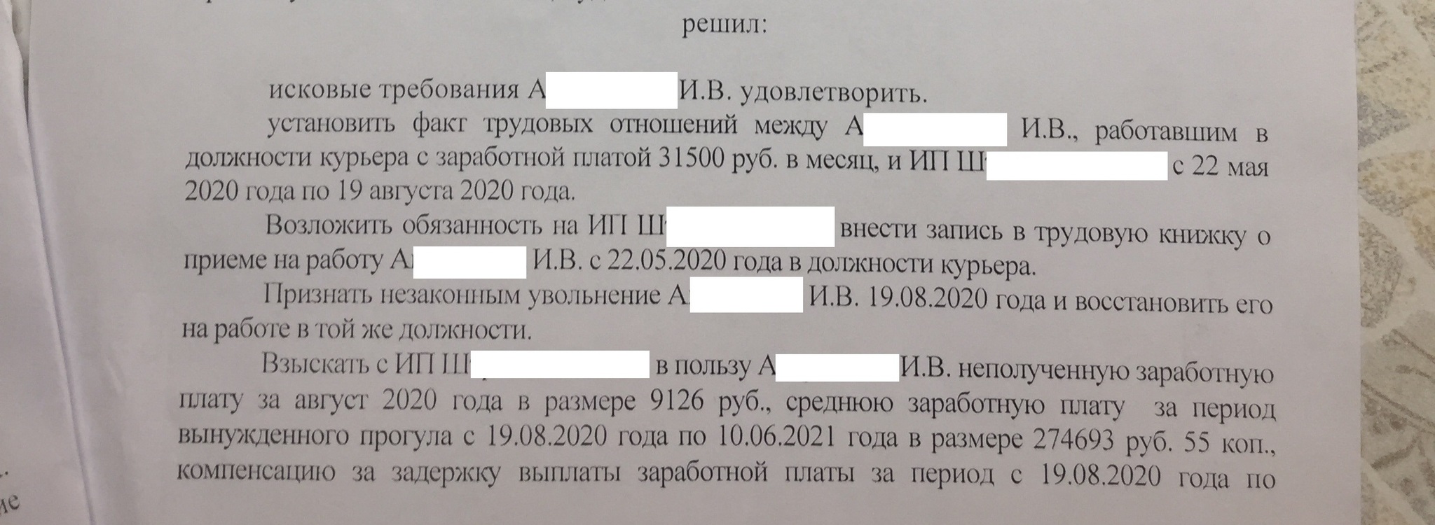 - Увольнение признано незаконным и ИПшника обязали восстановить парня на работе.