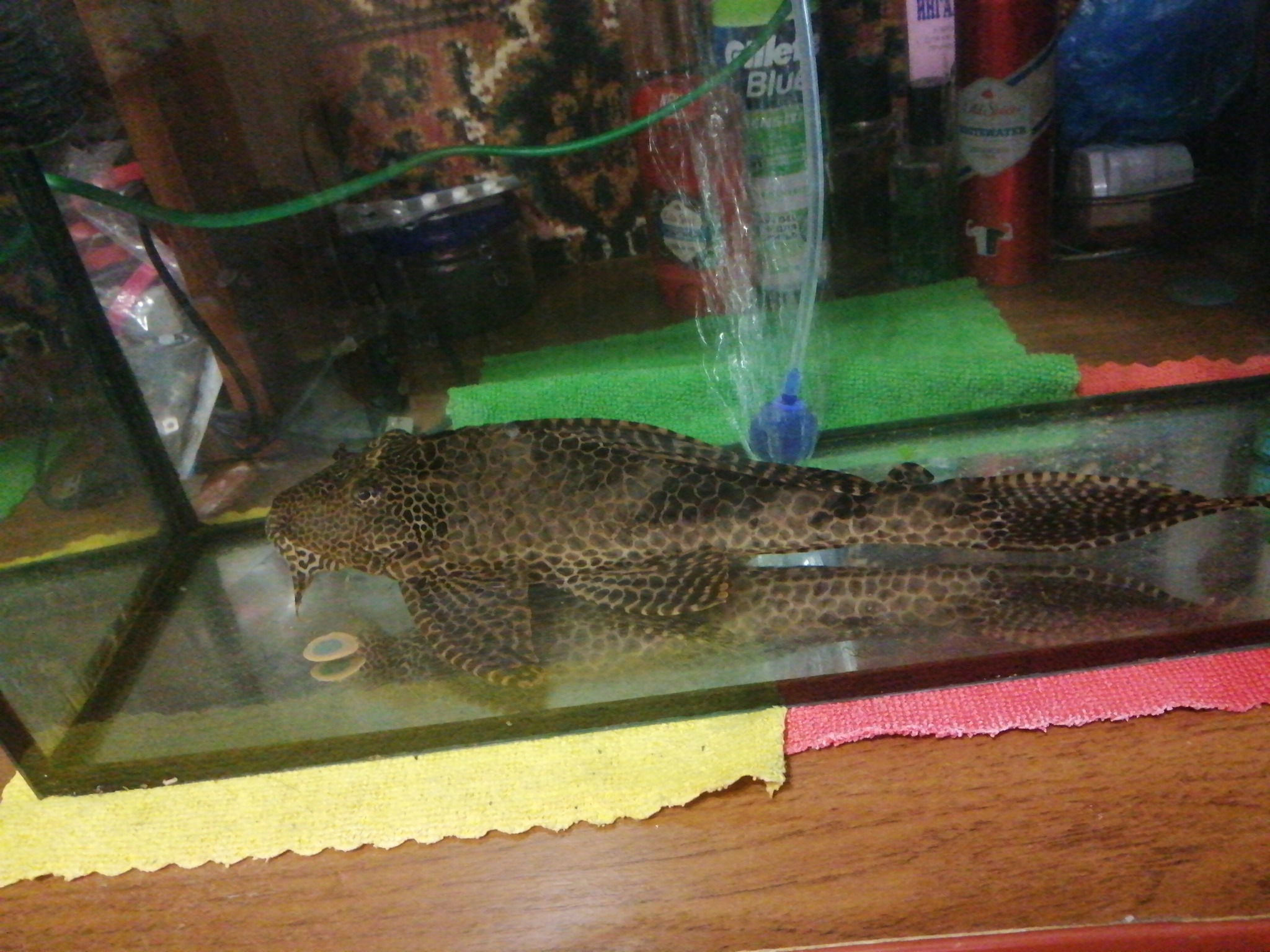 Пулей лечу к нему, забираю сома - жив... Пришлось экстренно переселять его с канистры в временный аквариум 30 литров. СОМ - ПТЕРИГОПЛИХТ очень огромный.