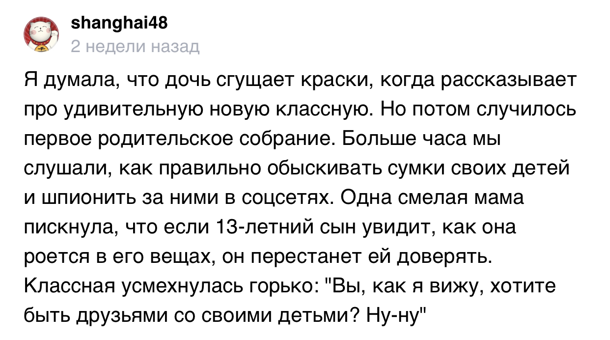 "У меня в 9 классе была учитель по черчению, пожилая Сатана в юбке. Чертила я оооочень аккуратно и правильно, а она выше 4 не ставила. Однажды я пожаловалась маме и она сказала: "Значит, ты недостаточно хорошо выполняешь работу!", на что я в сердцах ей ответила: "Ну, сделай, тогда ты одну, докажи, что можно лучше".