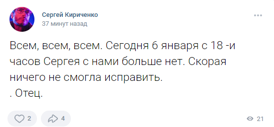 Умер отличный художник и хороший человек Сергей Кириченко , на пикабу его знали под ником @Rimrus. На его страничке https://vk.com/rimrus , сообщил отец. Покойся с миром.