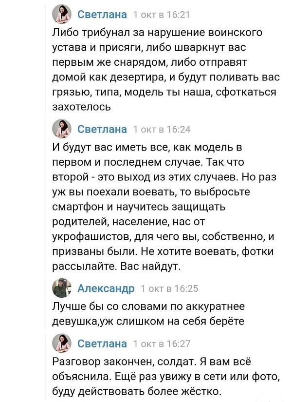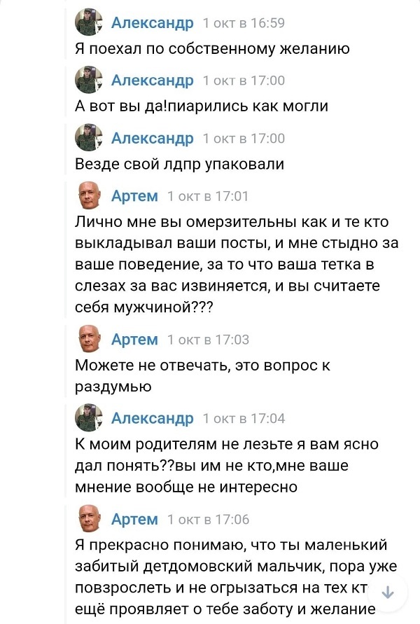 Публикации не оценили местные чиновники. Так, Светлана Новикова, начальник отдела культуры Кулебакской администрации, и Артём Веснин, член партии ЛДПР, начали писать угрозы с указанием удалить опубликованный контент, а также сообщения о том, что Александр «опозорил всех тех», кто вместе с ним направился на территорию боевых действий.