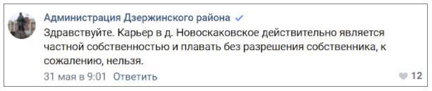 В конце мая жители Дзержинского района решили поплавать в этом карьере на SUP-бордах. К ним на моторной лодке подплыли люди, которые представились работниками базы отдыха "Кукушка" и сказали, что в водоёме плавать запрещено, поскольку он частный. SUP-бордисты обратились за разъяснениями в администрацию Дзержинского района. Чиновники пришли в комменты ВК и смущённо рассказали, что да, мол, это раньше карьер был муниципальным, а теперь он "действительно является частной собственностью". Поэтому хрен вам, граждане, а не заплывы по озеру. Ничего поделать нельзя, это всё проклятые коммерсанты не дают жить простым людям!