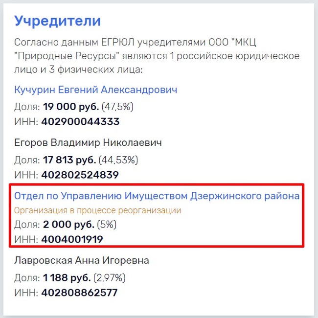 Знаете, что скрывается под аббревиатурой "МКЦ"? "Муниципально-коммерческий центр"! При чём тут "муниципальность" этого центра? А просто одним из учредителей ООО "МКЦ "Природные ресурсы" был отдел по управлению имуществом Дзержинского района Калужской области: