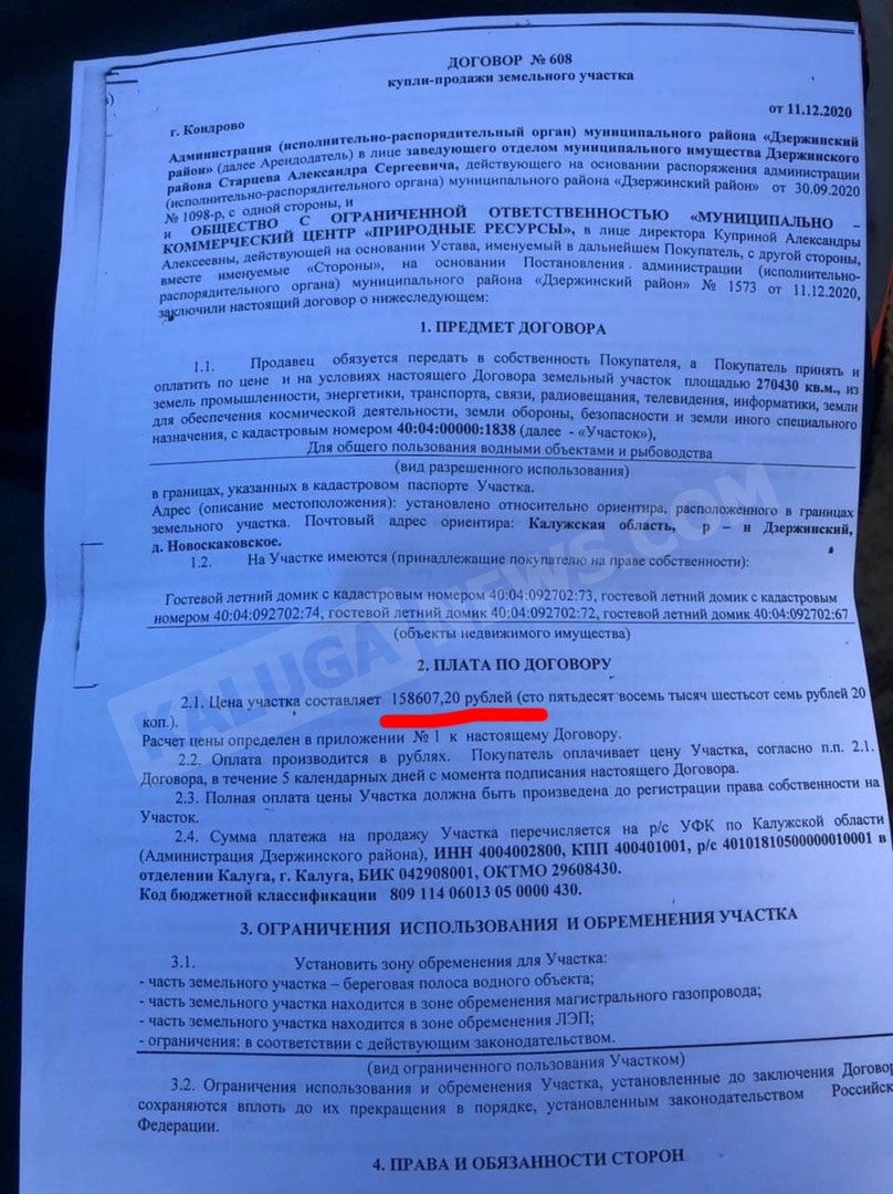 В руках местных журналистов оказался договор, из которого следует, что в декабре 2020 года администрация Дзержинского района в лице завотделом муниципального имущества Александра Старцева сама продала озеро этому МКЦ. Причём участок площадью 270 430 кв. метров был продан всего за 159 тысяч рублей!