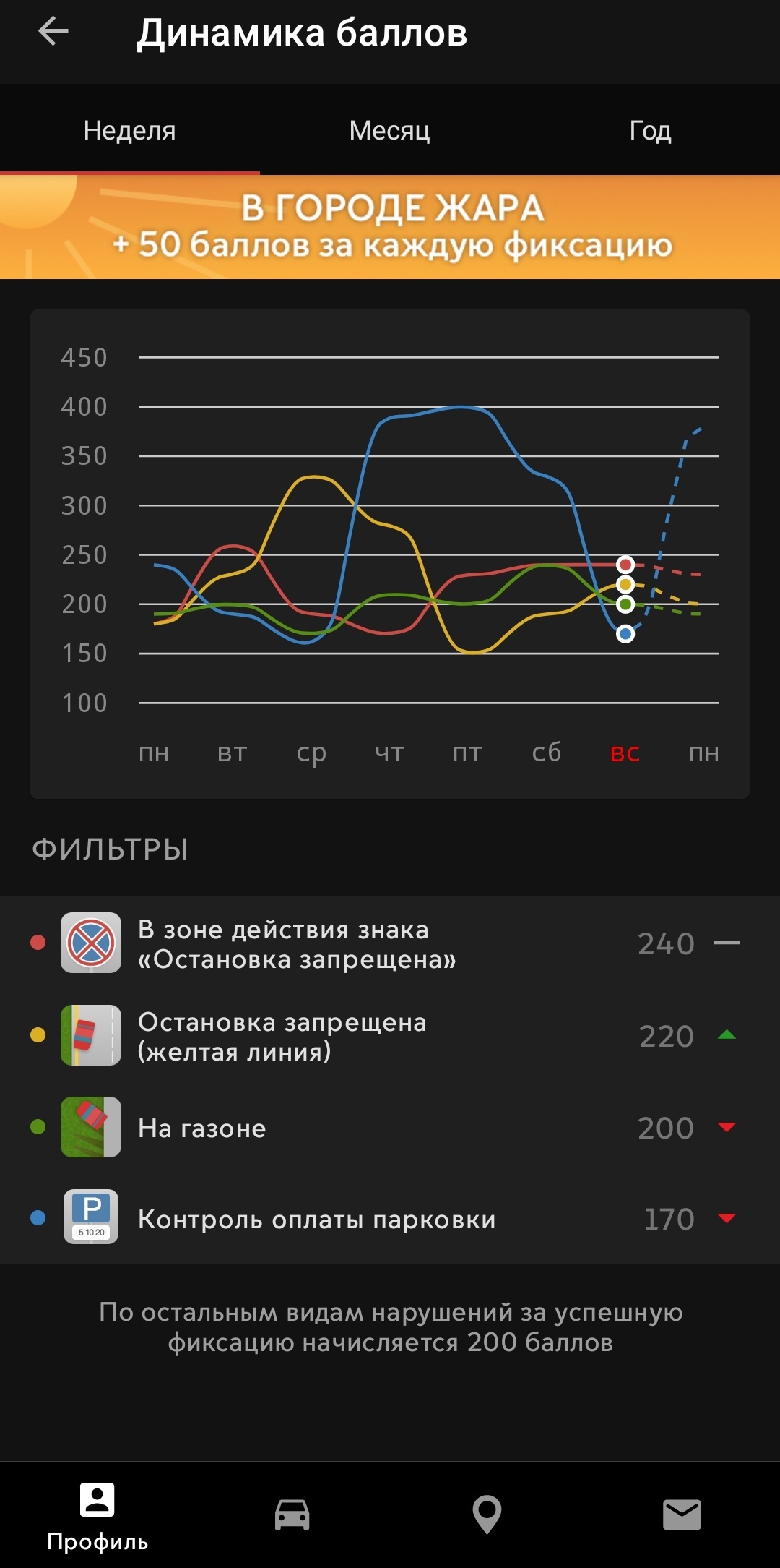 Пока суть да дело, скачал приложение "помощник Москвы", а там, оказывается, баллы дают за фиксации штрафов. Около 200 за каждую оштрафованную машину. На эти баллы можно купить сертификаты в продуктовый по соотношению 3 балла = 1 рубль.