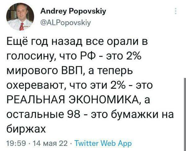 06.05.2022. The Economist, Великобритания. Сломить российскую экономику оказалось не так просто: она постепенно встает на ноги. Финансовая паника улеглась, россияне снова свободно тратят деньги. Да, розничные цены в России с начала года выросли на 10 с лишним процентов. Но для русских, привыкших к подобным событиям, это не показалось проблемой. После недолгого мартовского затишья россияне снова стали свободно тратить деньги в кафе, барах и ресторанах. Российская экономика, несомненно, сокращается, но прогнозы некоторых экономистов о 15-процентном сокращении ВВП в этом году начинают казаться чрезмерно пессимистическими.//Совершенно верно. Не дождутся.