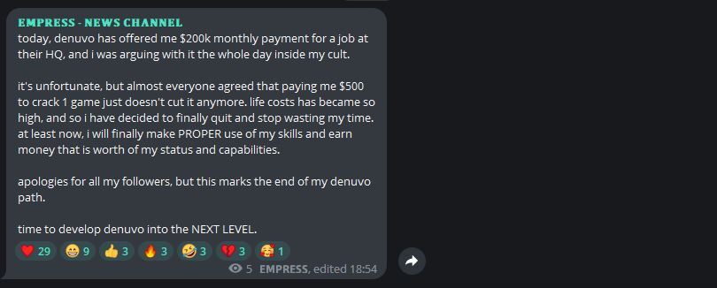 Сегодня EMPRESS выложила пост, в котором написала, что Denuvo предложили ей $200K долларов в месяц, чтобы она на них работала. Недвусмысленно она дает понять, что предложение ей понравилось и она его приняла.