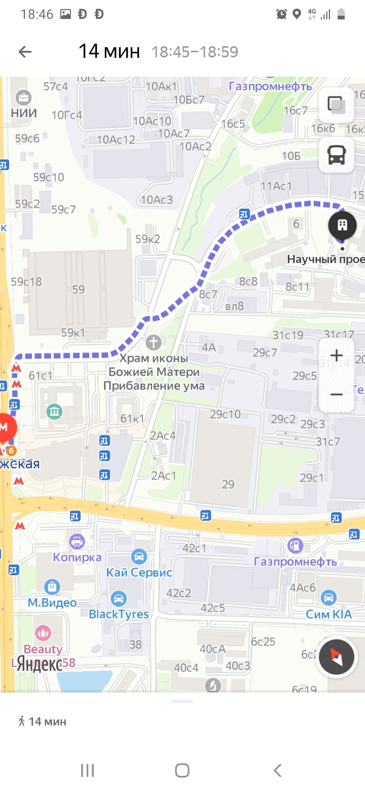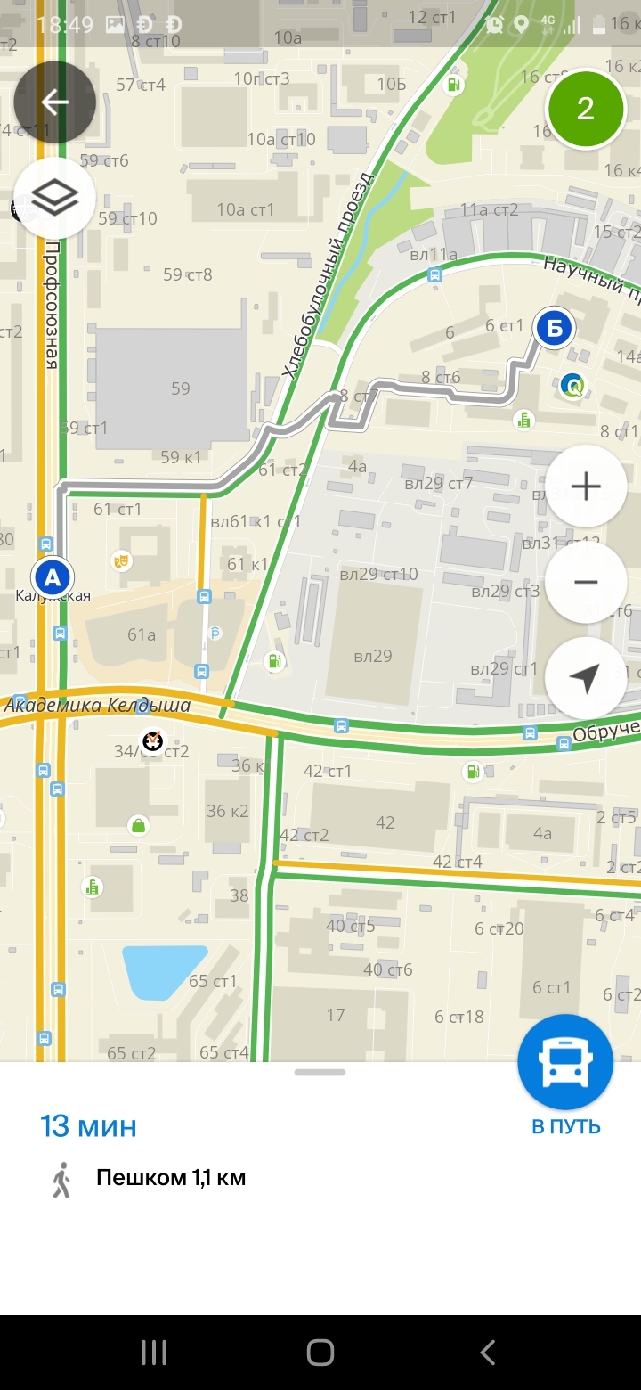 Так вот, нужно было проложить маршрут от станции метро "Калужская" до адреса Научный проезд, д.10.