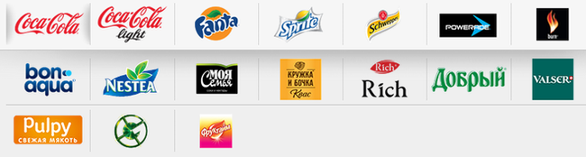 Coca Cola, Fanta, Sprite, Schweppes, Powerade, Burn, Bon Aqua, Fuse Tea, Моя Семья, Кружка и Бочка, Rich, Добрый, Valser, Pulpy.
