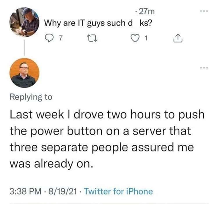 - На прошлой недели я ехал два часа, чтобы нажать на кнопку включения сервера, про которую три разных человека уверяли меня, что она включена.