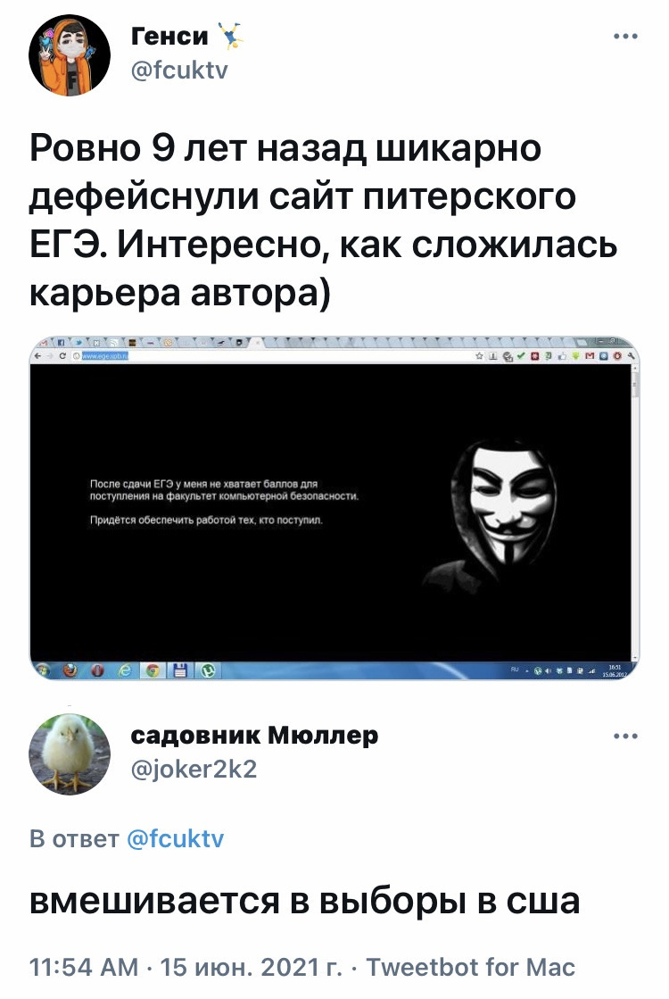 - Я пытался встать на учёт биржи занятости для получения пособия по безработице. Два дня пытался заполнить регистрационную форму у них на сайте, нашёл 173 бага, форму заполнить так и не смог. Когда моё терпение лопнуло, я позвонил им на горячую линию заявить о том, что их долбаный сайт не работает, для решения вопроса меня связали с IT тделом, собственно, где я теперь и работаю.
