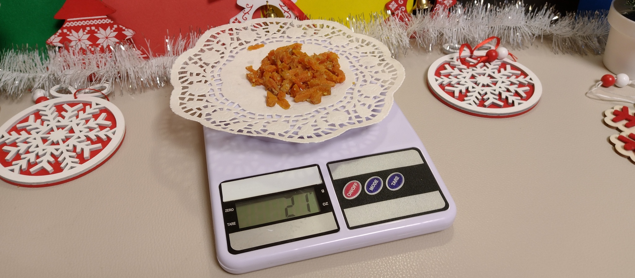 затем мы отделяем морковку от риса и тоже взвешиваем,морковка в меру мягкая вареная,форму держит по весу получилось 21 грамм