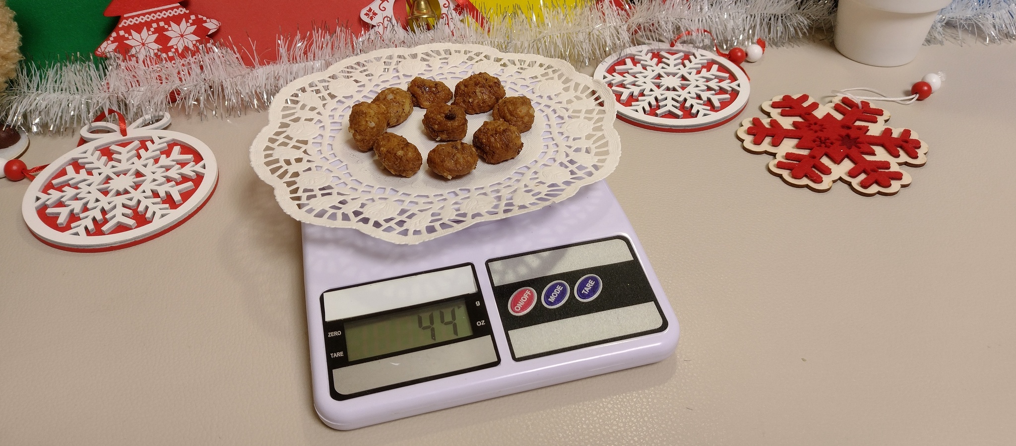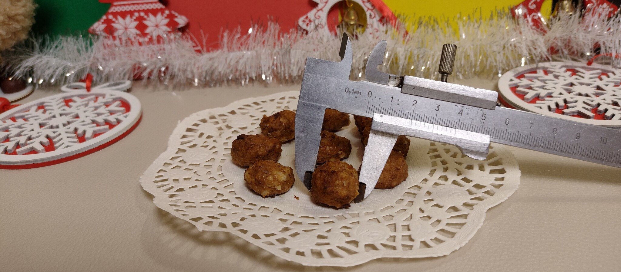 по форме они достаточно круглые поэтому будем использовать штангенциркуль для измерения их объема ,диаметр средней фрикадельки 20 мм