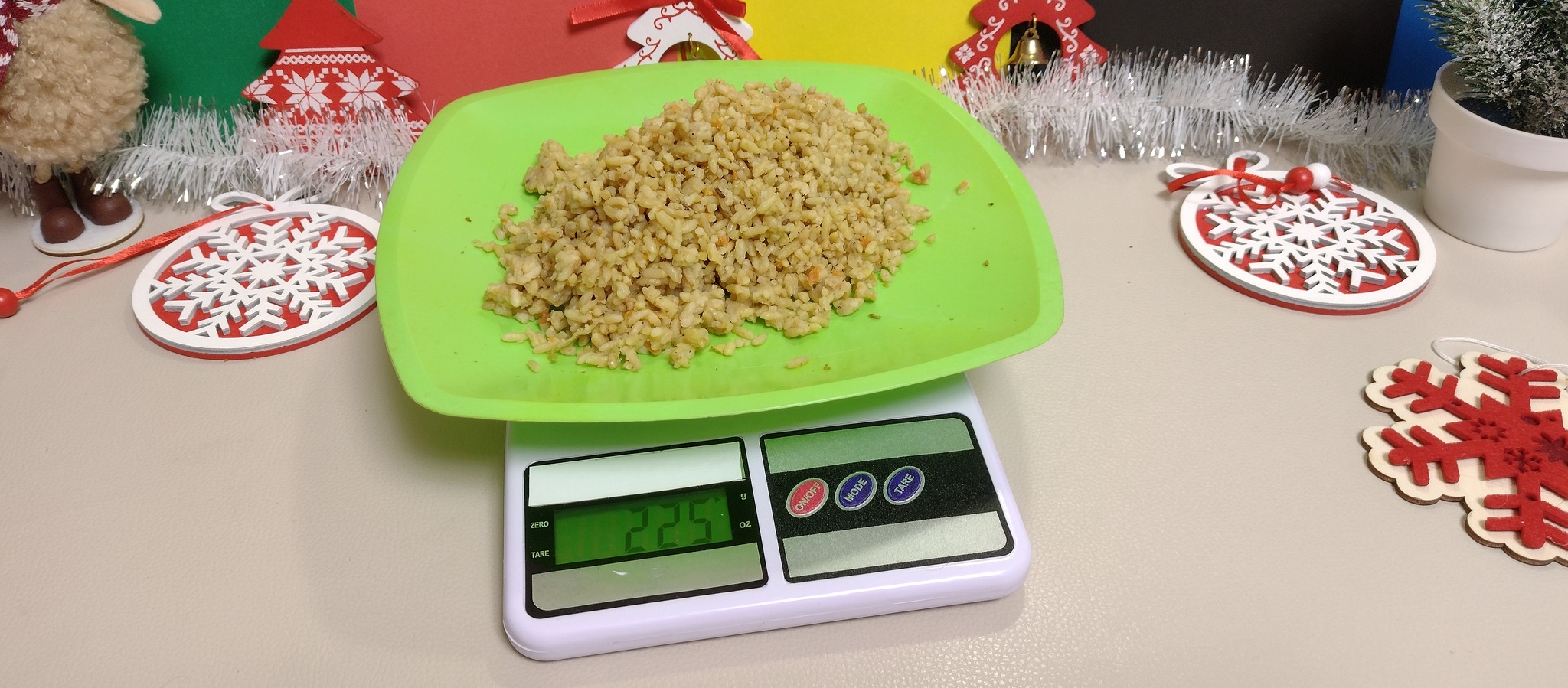 ну нет конечно я не бросил и решил досчитать до конца но на этот раз применил смекалочку, берем и взвешиваем весь рис общий вес 225 грамм