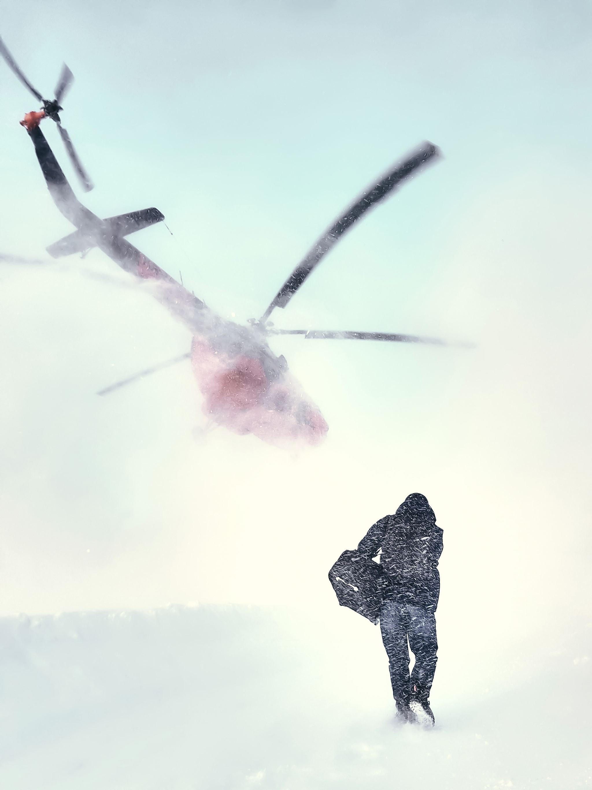 Первый на S8 в 2020 году, когда нас перебрасывали вертолётом на вахту. Как сейчас помню. С рюкзаком на спине и сумкой в руке я достаю телефон, чтобы сфотографировать вертолёт. Он взлетает, воздухом от винта меня опрокидывает в сугроб, а рука продолжает вслепую давить на кнопку съёмки. Как итог, получился вот такой кадр, которым я всё ещё горжусь