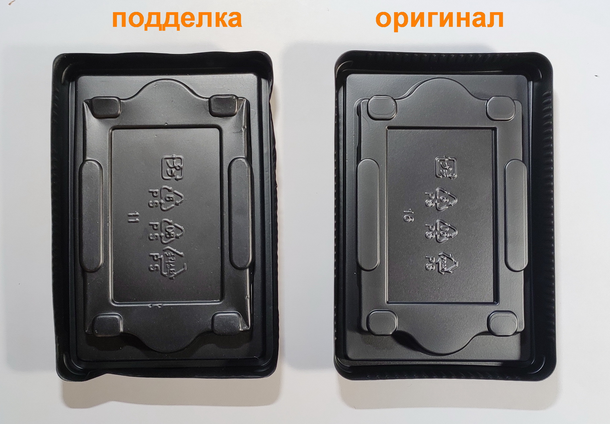 7) У подделки пластиковая коробочка из более тонкого пластика и "идёт волнами", у оригинала пластик более толстый и имеет стабильную форму.