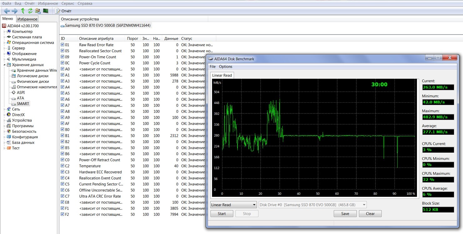 4) Тест линейного чтения показывает скоростя 40-480мб/с, среднее значение 250 мб/с – вдвое ниже оригинала