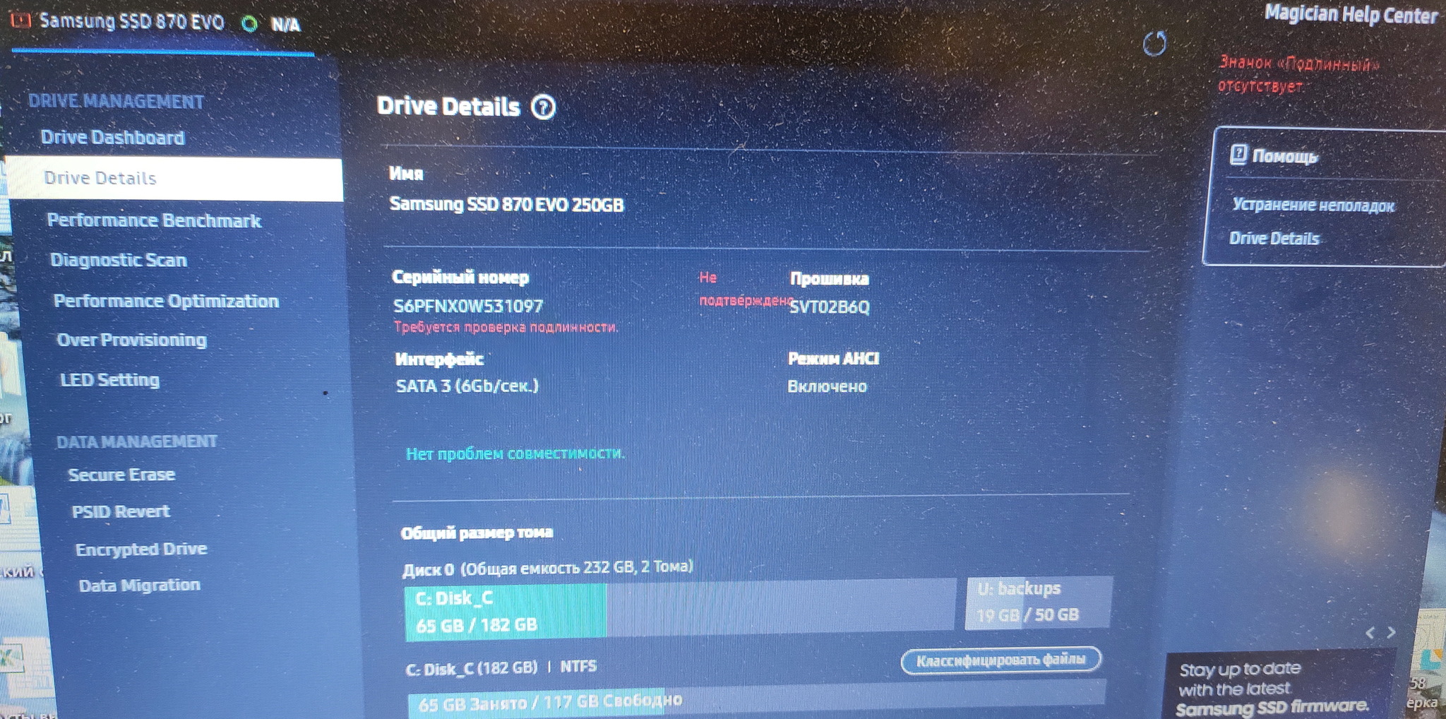 По Samsung Magician, скачанное с официального сайта выдаёт следующее при проверке SSD на подлинность: