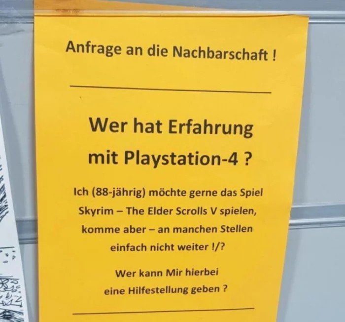 88-летний житель Германии Клаус-Юрген Лангнер, большой поклонник The Elder Scrolls III: Morrowind на ПК, не смог найти выход из стартовой крепости в Skyrim на PS4 из-за того, что не разобрался с управлением на контроллере. Тогда он решил попросить о помощи, и в марте распечатал 100 листовок, расклеив их по своему округу Шпандау в Берлине.